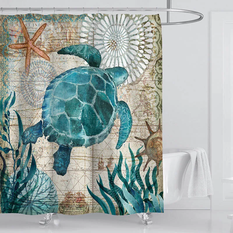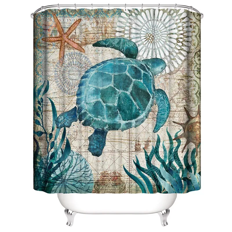 Product Name: Cortina de baño tortuga marina Cortina de ducha de poliéster con ganchos cortina de baño impermeable juego de alfombrillas de baño BDF99