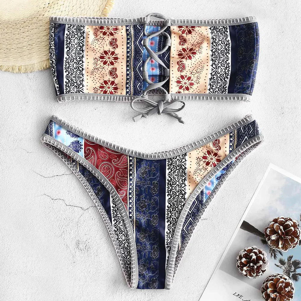 Special Offer ZAFUL Bikini Lace Up Flower Strapless Bikini Set Push Up traje de baño de cintura baja mujeres traje de baño sólido Biquini Sexy traje de baño Discount 30% Today!