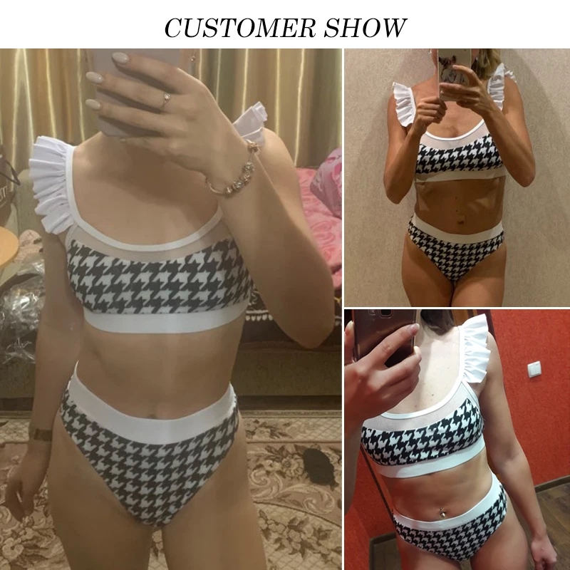 Product Name: Peachtan traje de baño de cintura alta Mujer Plaid mesh bikini set 2020 Ruffle swimwear mujeres transparente traje de baño Vintage biquini