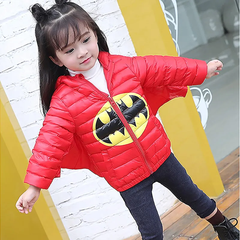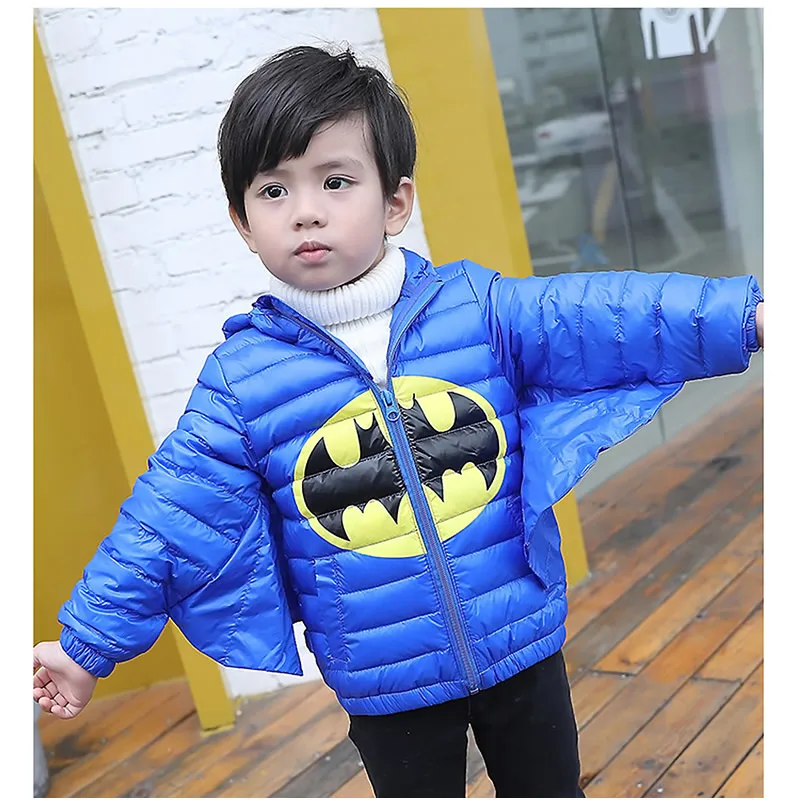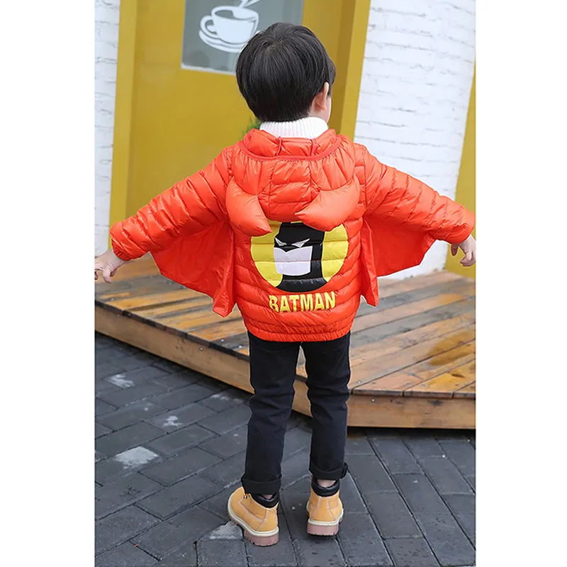 Product Name: Bebé niña niño abajo Chaqueta corta de los niños de invierno Batman disfraces de cosplay blancos pato abajo abrigo chaqueta de niño con capucha con cuerno de nieve prendas de vestir
