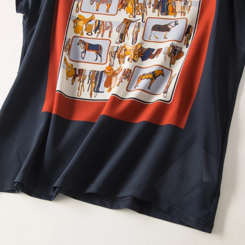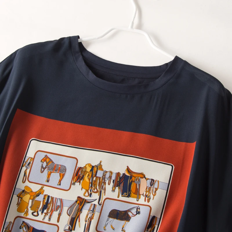 Special Offer Camiseta estampada de seda REAL de las mujeres Camiseta de manga corta de murciélago Casual Camisetas cuello redondo 2019 otoño azul marino top Discount 30% Today!