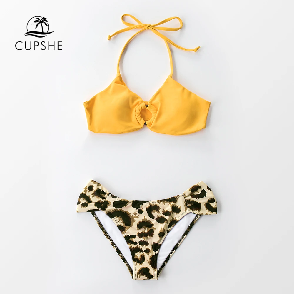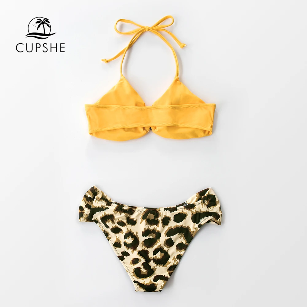Product Name: CUPSHE amarillo y leopardo bikini sexy con escote Halter cortado traje de baño de cintura baja dos piezas traje de baño mujeres 2020 trajes de baño de playa