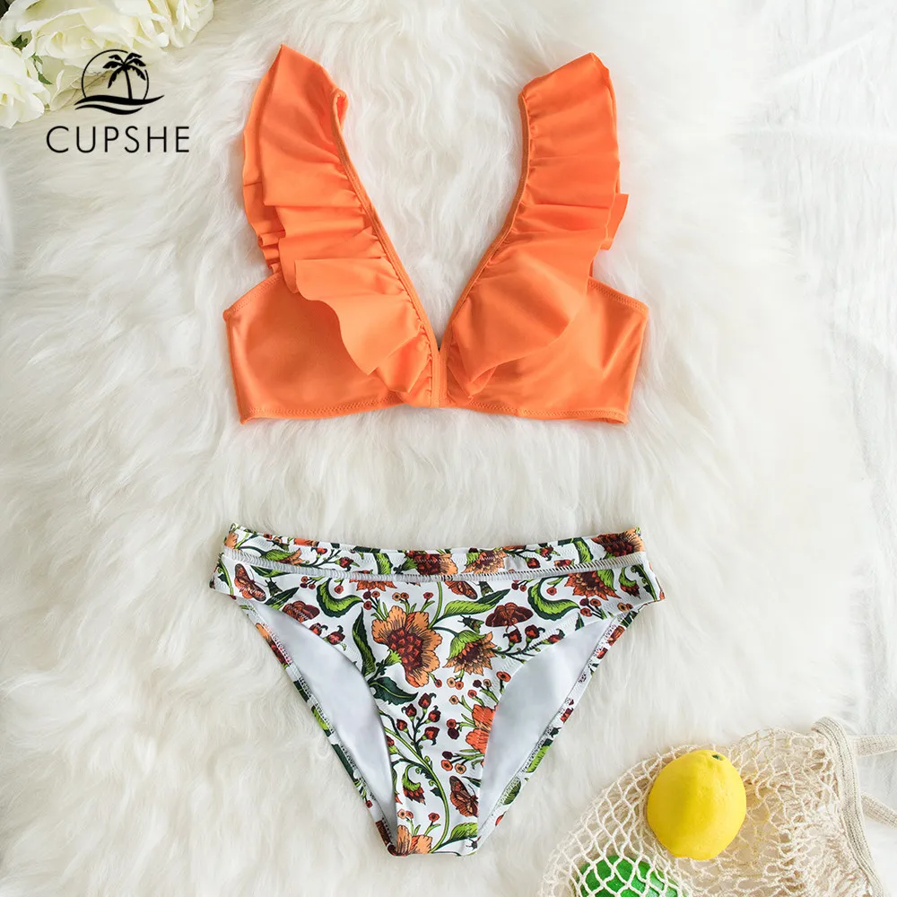 Special Offer Conjunto de Bikini con volantes de color naranja CUPSHE con fondo Floral traje de baño Sexy de dos piezas traje de baño de mujer 2020 traje de baño de playa Biquinis Discount 42% Today!
